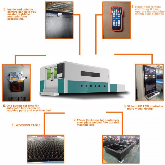 Čitav stroj sastoji se od alatnog stroja, dijelova za kretanje, dijelova za upravljanje električnom opremom i ostalih pomoćnih dijelova. Putem upravljačkog sustava za upravljanje troosnim dijelovima pokreta, tako da se može voziti na glavi laserskog rezanja za postizanje stabilnog, tačnog i brzog kretanja; X i Y osa usvojena je uvezenim originalnim pakovanjem visoke kvalitete i preciznosti HIWIN linearna vodilica, radni stol usvojen kvadratnom cijevi za zavarivanje cjelokupnog stroja, tretman za ublažavanje opterećenja, maksimalno opterećenje mesa može dobiti 500 KG, također ima univerzalni kuglični ležaj, vanjski postavljeni periferni uređaj za stezanje, koristite potpuno zatvoreni uređaj za zaštitu od prašine, fotoelektrični senzor i ostale precizne dijelove za pozicioniranje kako bi se osigurala tačnost prijenosa.